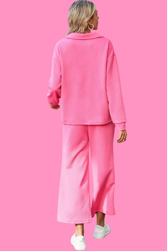 Bonbon Solid Textured Collared V Neck Top and Wide Leg Pants Set