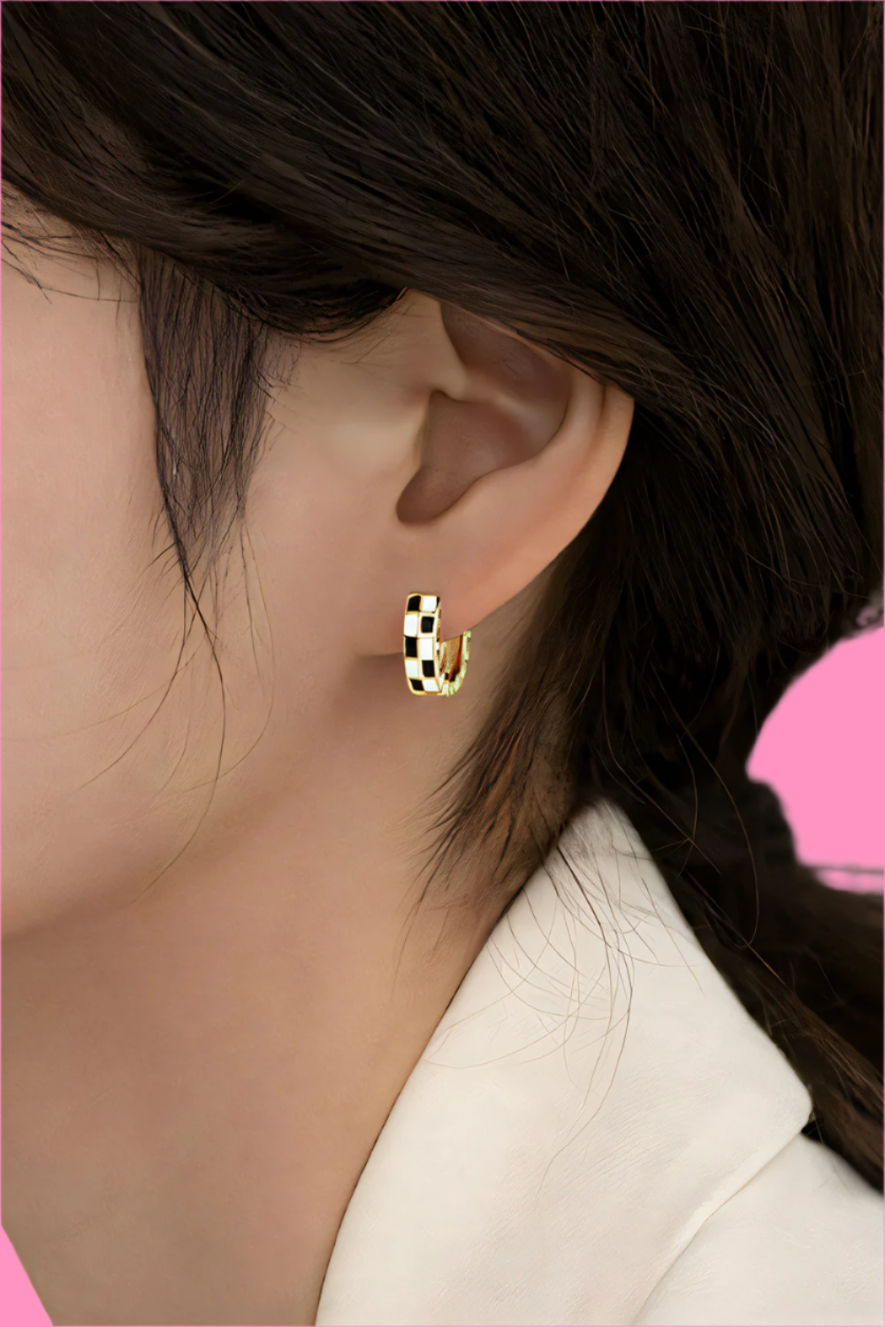 - Elevate your style with these stunning Gold Checkerboard Small Hoop Earrings, crafted from high-quality copper with a radiant gold finish.